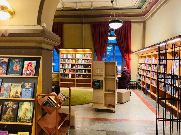 トゥルクからヘルシンキに戻り、今日はずっと気になっていたクラシックな建物のリクハルディンカトゥ図書館をようやく訪問することができました!こちらは、建築家Theodor Höijerによる設計によって、1882年に建てられた北欧初の公立図書館なのだそうです。入り口から入って左側に進むと、明るいレモンイエロー色の壁のキッズスペースがありました。