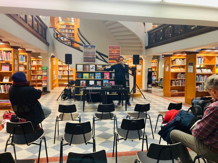 かなり居心地が良くて長居をしていたので、そろそろ帰ろうと思ったその時、一人の男性が見たことがない楽器を取り出して小さなコンサートが始まりました。静かな音楽が体に染みわたってきて、ヒーリング効果で勝手に体が健康な気分になるような、物語を見ているような不思議な体験でした。お金を払っていなくても、こんな素敵な体験ができる図書館は素晴らしいなあと思いました。ちなみに、この男性が演奏している後ろにある美しく白い螺旋階段がこの建物のシンボルとなっています。