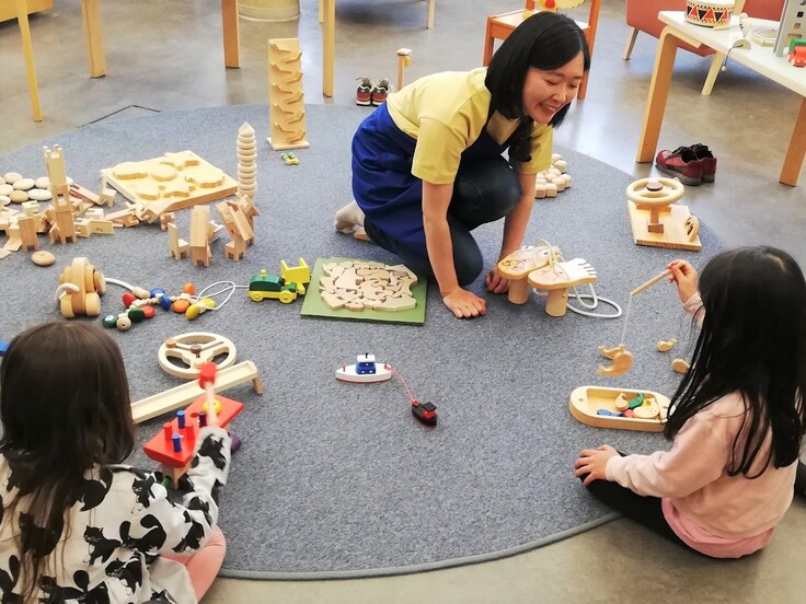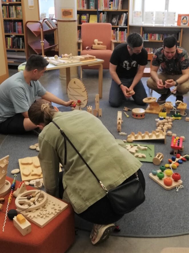 図書館の子どもエリア以外の担当の方も、木のおもちゃを体験しに来てくださり、早速来館者の方々へ楽しさを伝える伝道師としてご活躍いただきました。楽しい図書館をつくりたいという思いに、私たちも少しだけでも参加できて光栄です。また秋に一緒にイベントができたらと嬉しいお誘いをいただきました。