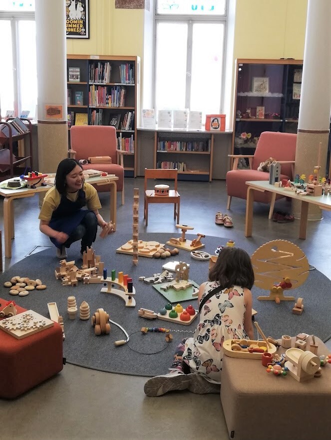 よく晴れた母の日の今日は、フィンランドに届いた木の香りが残るあたらしい木のおもちゃを2つのスーツケースから出して、ヘルシンキのクラシックなリクハルディンカトゥ図書館でイベントを行いました。私たちのプロジェクトに共感してくださった司書の方々のサポートのおかげで、今回のイベントを実現することができました。