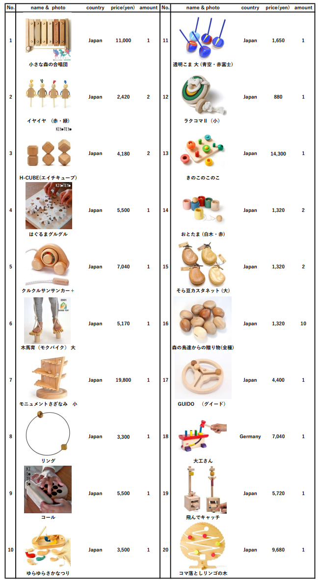 また、東京おもちゃ美術館のミュージアムショップAPTYより購入させていただいた「グッド・トイ」を中心としたおもちゃのリストもこちらに共有させていただきます。