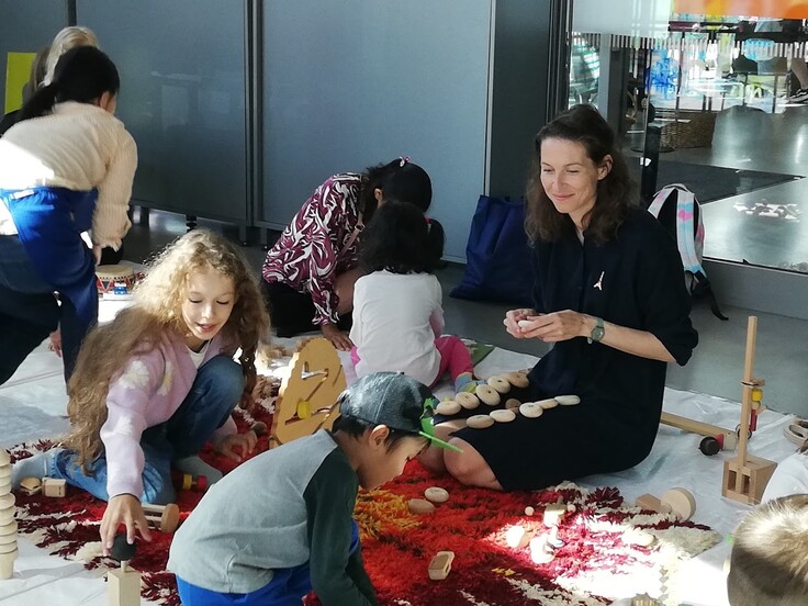 こちらのお母さんと娘さんは、フィンランドで生活をスタートさせたばかりで、なかなかまだ慣れないところもあったそうなのですが、この遊び場に来たことで遊ぶことを純粋に楽しみ、ほがらかな気分になったことを私たちに伝えてくださいました。おそらく全部の木のおもちゃを試してくれたのではないかと思います。お母さんはちょうどこの写真のように「まあるいつみき」がとっても気に入って膝の上に乗っけて木の感触を味わっていました。