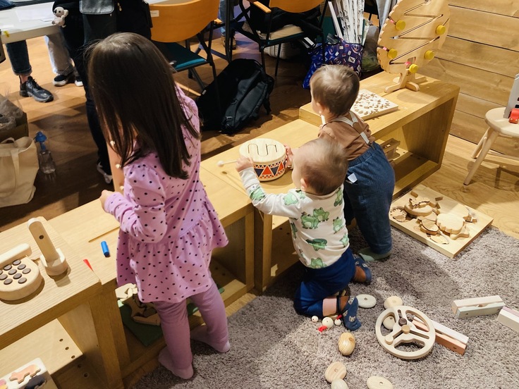 とてもリアクションのユニークな子がいて、お母さんが微笑んでずっと横で見守っていたところがとても印象に残っています。どんなおもちゃを見ても新鮮な表情で驚いたり、大きく笑ったりしている子で、いっぱい遊んで眠くなり目がとろんとしてからも、クーゲルバーンという車がカタカタ坂を下りるおもちゃをずっと繰り返していて、お母さんと一緒に微笑ましく見守っていました。