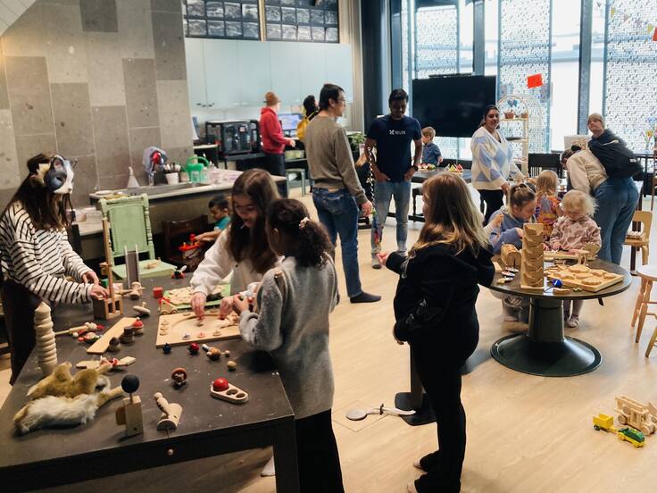 リップライヴァ図書館は、Touch Woodのメンバー全員で集まった際に木のおもちゃのイベントとよく合いそうな場所として候補にあがった図書館で、思い切ってメールを送ってみたところ、図書館からも興味を持っていただいたことで今回のイベントが実現しました。少しヘルシンキから離れているので、私は一度も行ったことがなかったのですが、スーツケースを一つ預かってもらう際に下見をして、どの場所を切り取ってもすごく居心地がいい図書館だなという印象を受けました。絵本コーナーもとても魅力的でしたが、すべり台やボルダリングなどアクティブな遊びができる場所でもあったので、イベントにはお絵描きや3Dプリンターの体験ができるワークショップコーナーをお借りすることにしました。