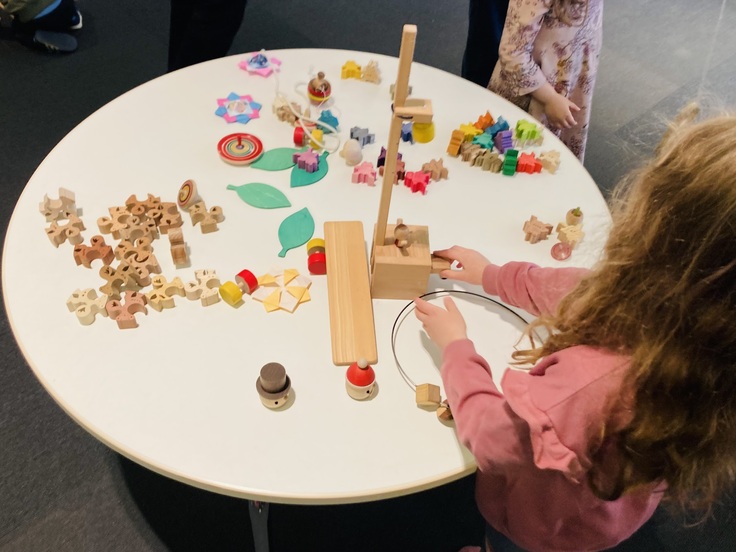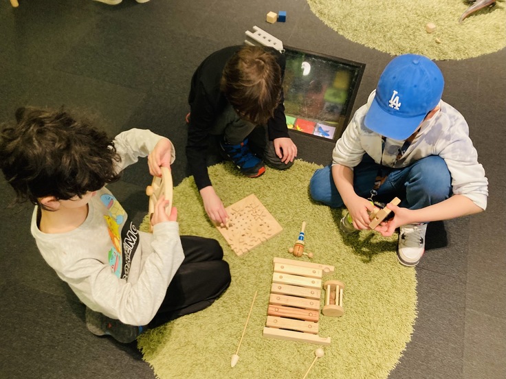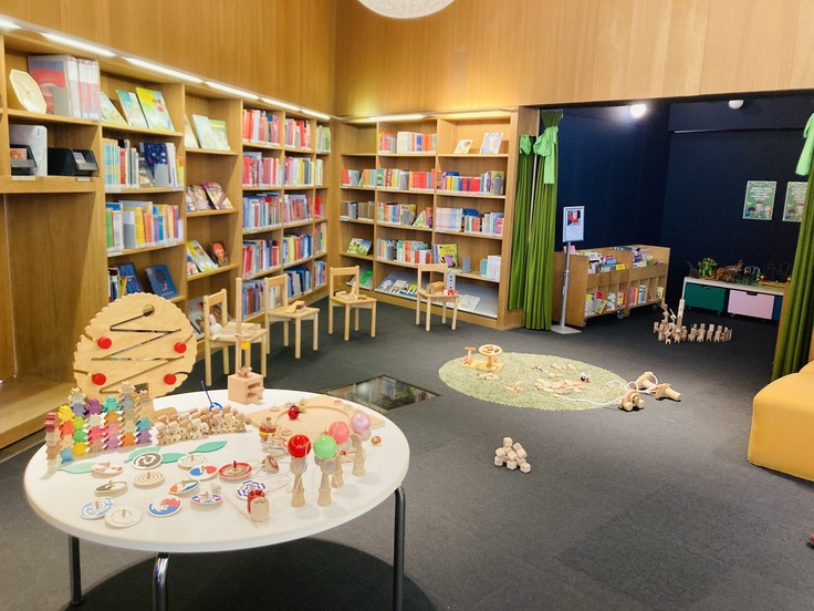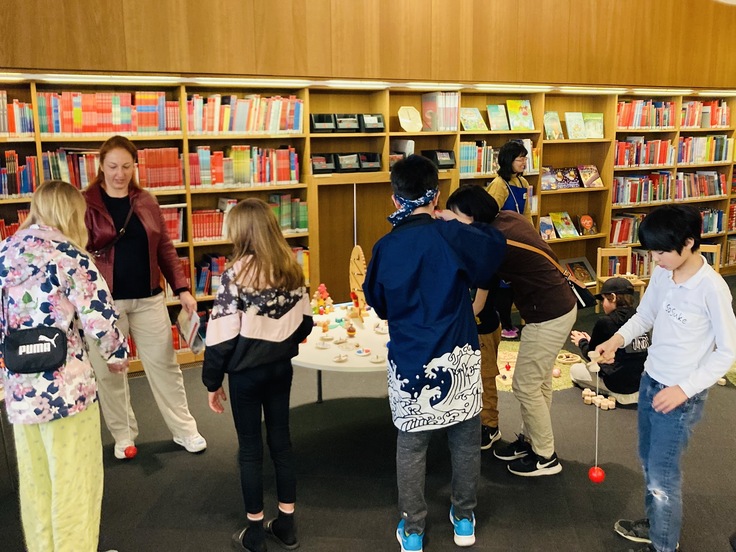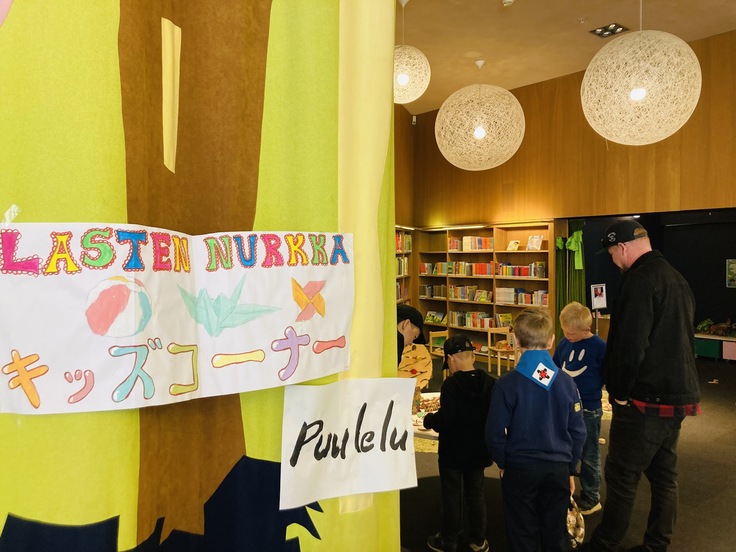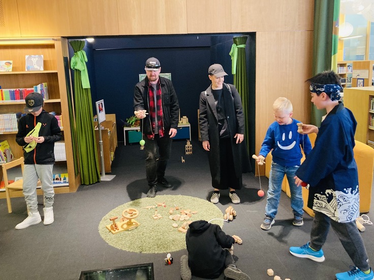 私たちは、キッズコーナーの一角で日本の木のおもちゃを体験していただく場所を任せていただきました。これまでフィンランドの色んな図書館にお邪魔させていただきましたが、どの図書館も居心地よく過ごせる工夫がされていることに驚きます。子どもたちが遊んだり、寝っ転がったり、くつろいだりしながらも、すぐ手に取れる場所に本があります。木のおもちゃも、そんな空間に自然と馴染んでいました。