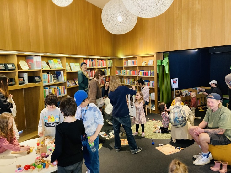 本を借りる途中に足を止めてくださる方が多く、本を片手に木のおもちゃで遊ぶようすをたくさん見かけたのも、図書館の会場ならではですね。