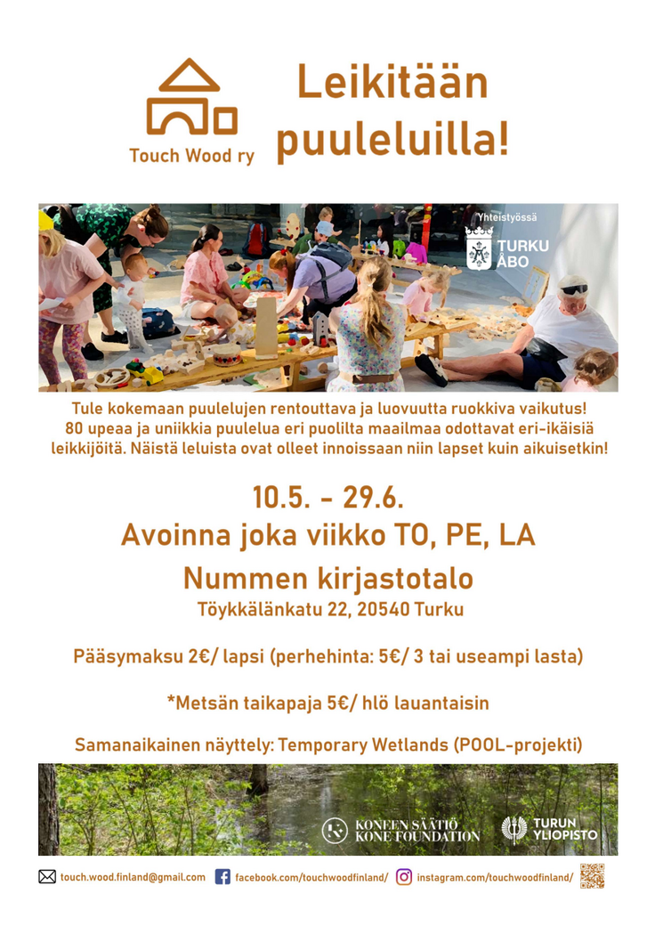 このトゥルク市立中央図書館は市の中心部にあり利用者する方が多く、昨年から木のおもちゃのイベントを開催してみたいなと思いアプローチしていた場所だったので、ついに実現できてとても嬉しかったです。木のおもちゃはフィンランド語で「Puulelu(プーレル)」と呼ばれていて、書道コーナーの方が筆で紙に書いてくださり、カッコいい看板をいただきました。