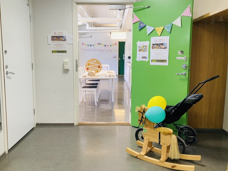 トゥルク市の市街地からバスで15分程の場所にあるNummi図書館に併設されている施設が、私たちの2か月間の木のおもちゃの遊び場です。この場所で5月、6月と木のおもちゃと遊びの楽しさを伝え続けています。市から無料でお借りしているこの施設には、家具がついていなかったので、倉光さんが今年の秋に同施設を借りる動物愛護団体と協力し、「Turun Ekotori」というリサイクルセンターからテーブルや椅子、そしてかわいらしい木馬まで用意してくださいました。