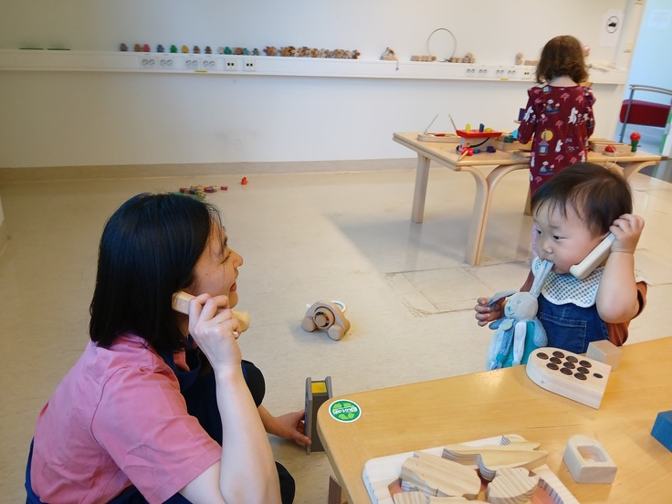 遊びのなかでは、本当の電話が無くても「もしもし」とお話することができます。