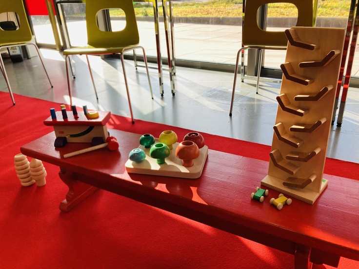 今年1月と3月にもお世話になった場所で、開催する私たちも安心して準備ができました。今回は多めの木のおもちゃを持っていく予定にしていたので、事前に荷物を預けさせていただいていて、当日朝に到着して、ゆとりを持っておもちゃを美しく並べることができました。この日は、インテリアデザインの学生で、以前は幼稚園の先生をしていたフィンランド人のTouch Woodのメンバーと一緒に子どもたちの遊びを見守りました。遊びの空間に関心があって学びを続けていて、これから遊び心ある空間をデザインしていきたい彼女にとっても、工夫の詰まったおもちゃが実際に子どもたちにどんな反応をもらうのか、近くで見ることができる良い刺激になったのではないかと思います。