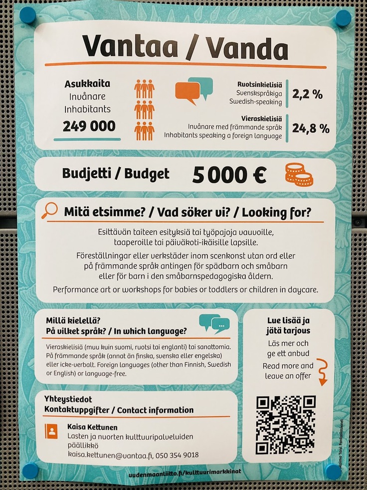 ひとつのプロジェクトが実際に形になっていくのも、今回のイベントの魅力のひとつです。会場の壁には、各自治体が求める文化プロジェクトとその予算が掲示されていて、より詳しく話を聴きに行くことができました。例えば、私たちにぴったりなターゲット(乳幼児向けの文化イベント)を持つVantaaの文化プロデューサーの方とお話ができました。実は昨年のKolibri FestivaaliですでにVantaaの文化センターを使わせていただいていたので、幸いなことにすでにとても良い印象を持っていただけていました。これから10月5日までに、来年に私たちができることをまとめて、プラットフォームを通してオファーを提出する予定です。
