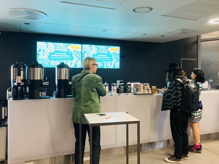 ここはフィンランドなので、この会場にもやっぱりコーヒースタンドがありました。どんなイベントにもコーヒーが必ず付いてきます。水、紅茶、コーヒーが無料で、とてもありがたかったです。