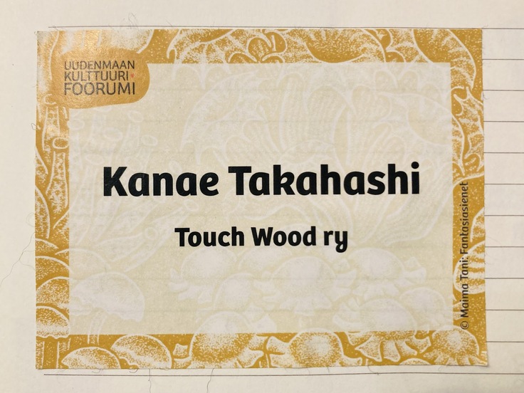 受付に行くと、事前申込みした名前で名札を用意してもらっていたので、それを受け取ることができました。「Touch Wood ry」と非営利の協会になってから初めての名札で、もらって嬉しくなりました。
