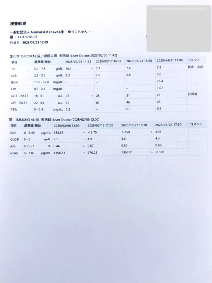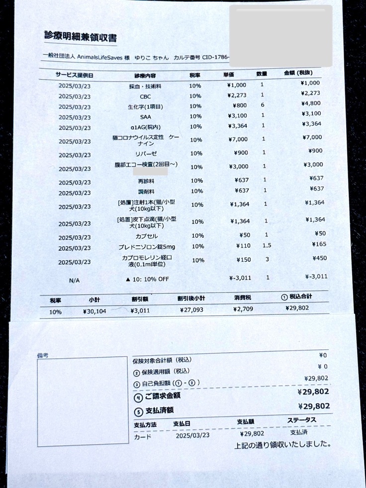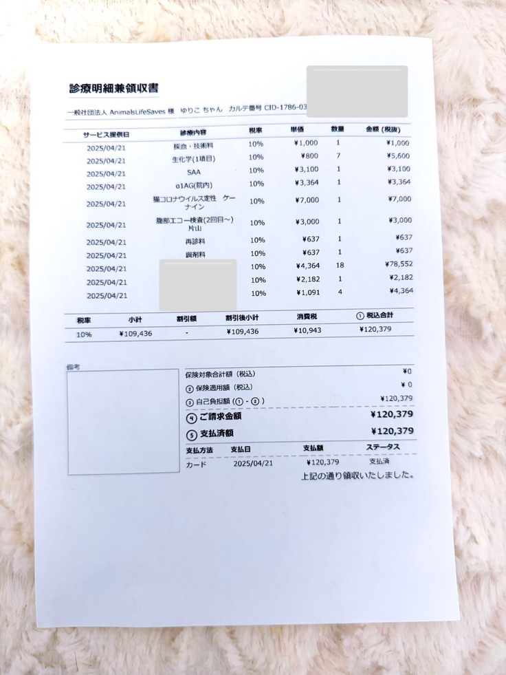 ・FIP診断前の治療費(ファーストゴールに含まれない部分 診療費・血液検査費・夜間救急病院費・約150,000円)