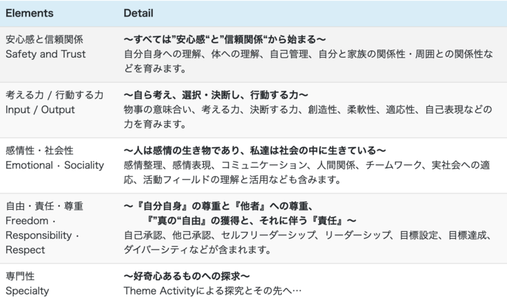 子どもたちは自己実現のための必要な“Elements(要素)”を育んでいきます。毎回の学びでは、下記の要素を学びの要素として組み込み、育んでいきます。