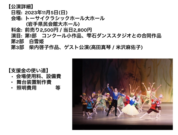 このたび、11月に行われる「第76回岩手芸術祭 藤井淳子ダンスタジオ ダンス公演2023」における単独公演に際し、当スタジオの作品をよりクオリティを高め、多くの方々に観ていただき、喜んでいただけるようにと考えております。