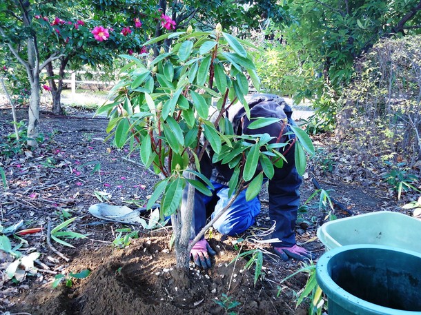 西洋シャクナゲの実際の植栽配置を決めていきます。