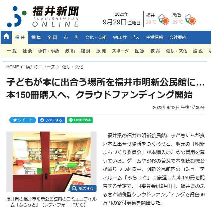 子どもが本に出合う場所を福井市明新公民館に…本150冊購入へ、クラウドファンディング開始 | 催し・文化 | 福井のニュース | 福井新聞ONLINE (fukuishimbun.co.jp)