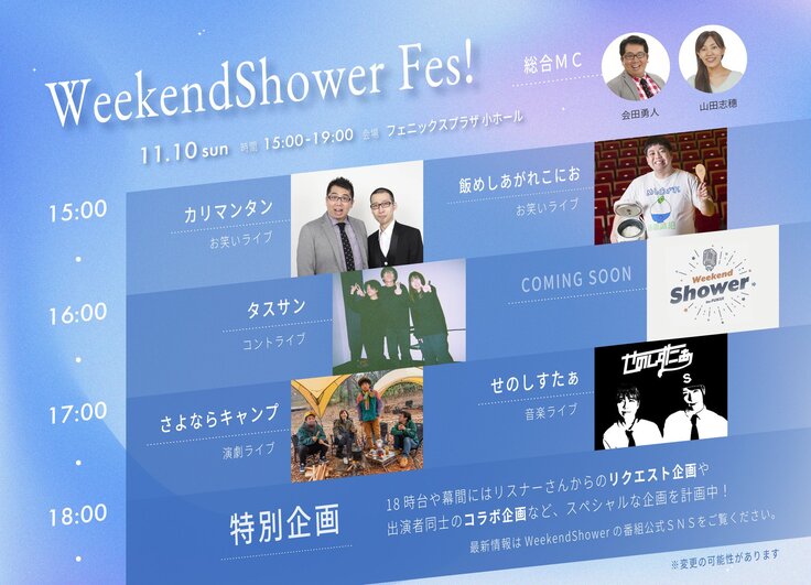 11月10日(日)に開催する『Weekend Shower Fes!』のタイムテーブルが決定しました!