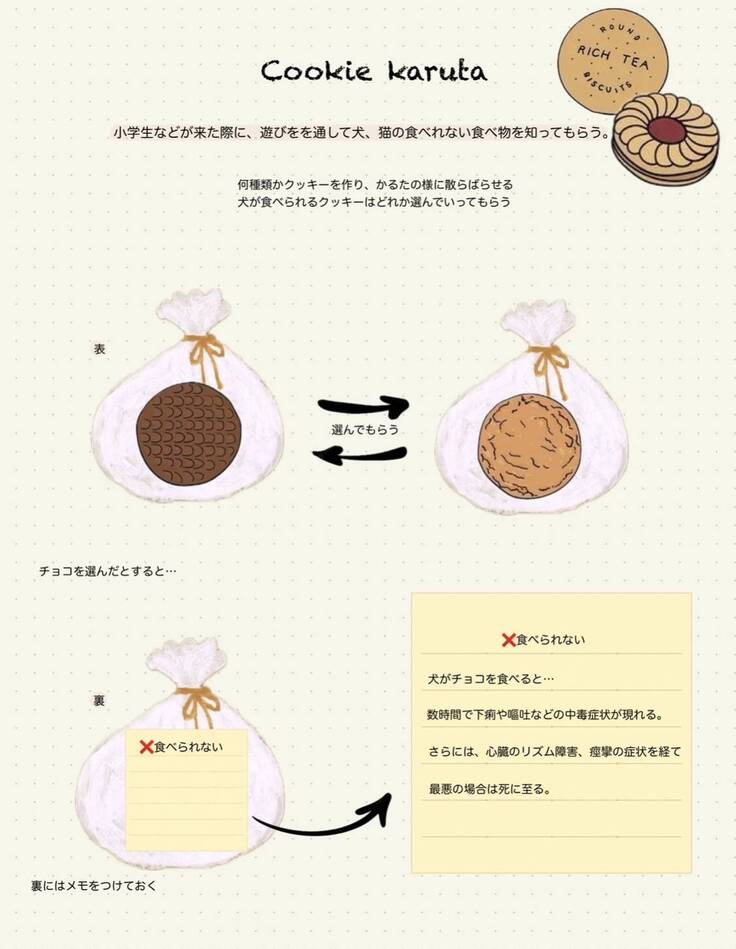 クッキーかるたとは袋に入れた数種類のクッキーから犬が食べられると思うものを選び、その答えを裏面に貼られた解答を確認しながら犬の食べてよいもの、ダメなものを学ぶ