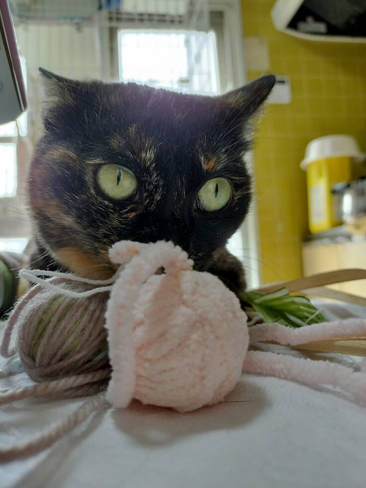 ↓作業してたら近くに来てくれた「さつき」 (さつきの手前)今回つくる猫じゃらしのモデル