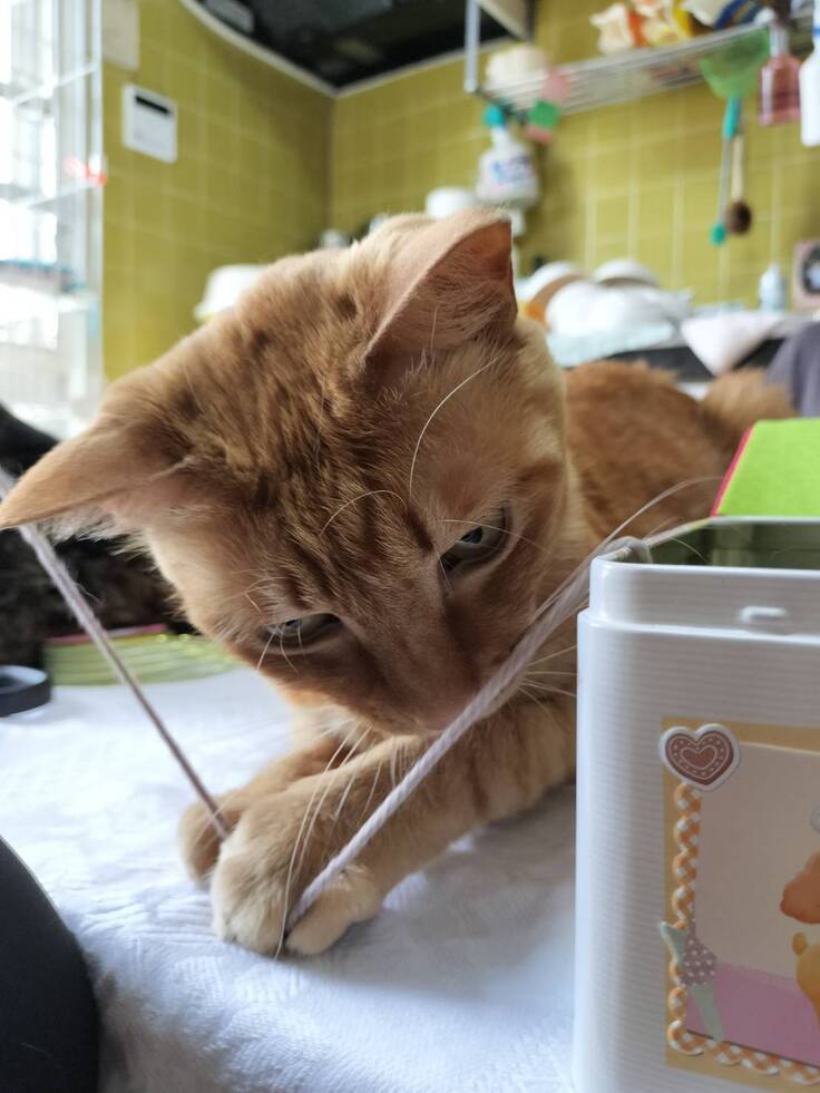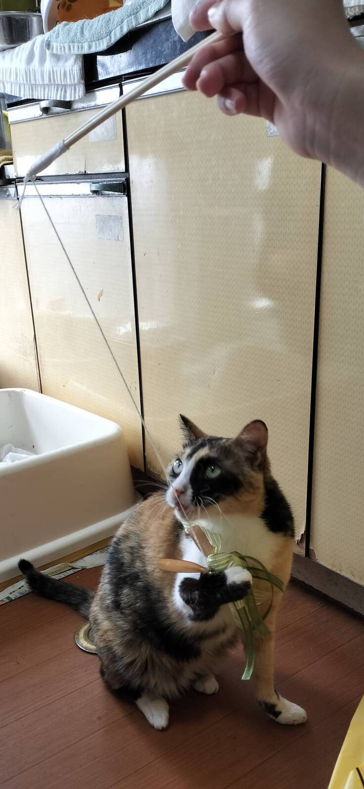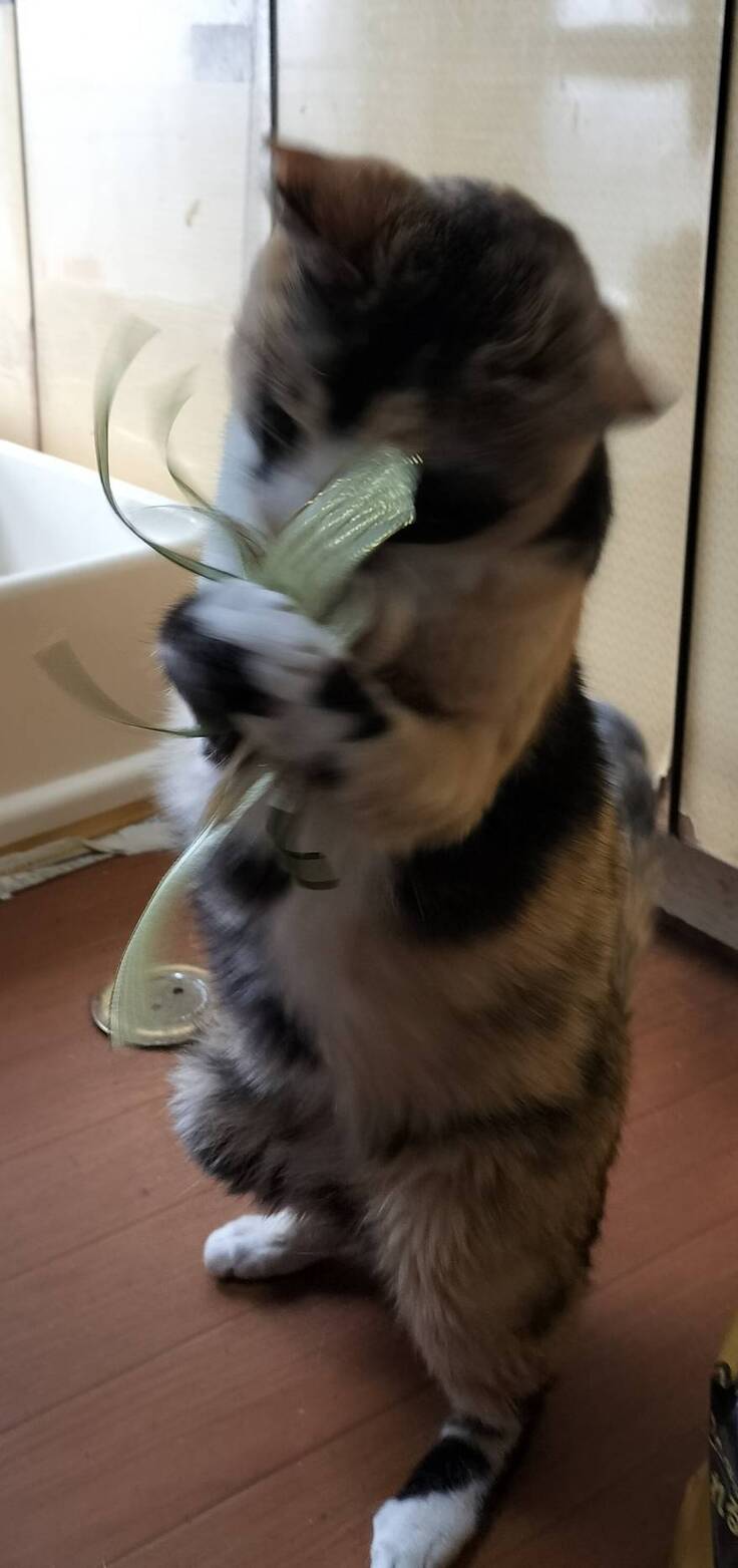 ↓リボンで作られた猫じゃらしで遊ぶ「モネ」