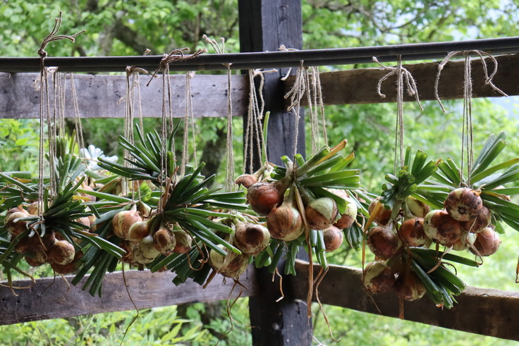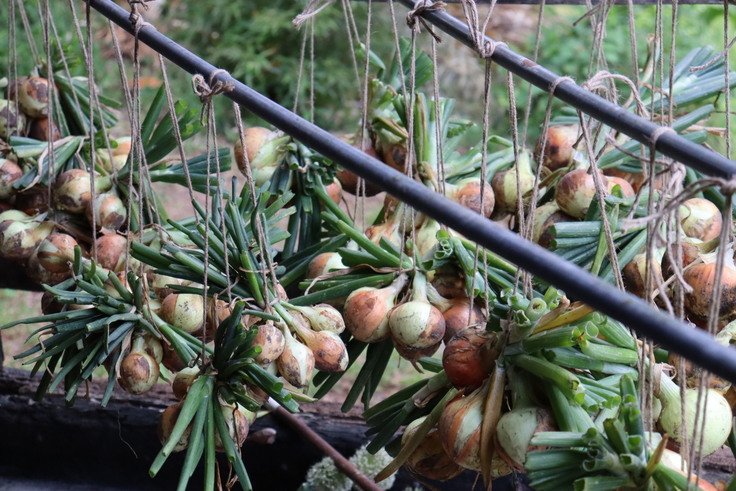 採れた玉ねぎは風通しの良い場所で保管すべく、かつて厩(うまや)だった半屋外スペースで吊るすことに。