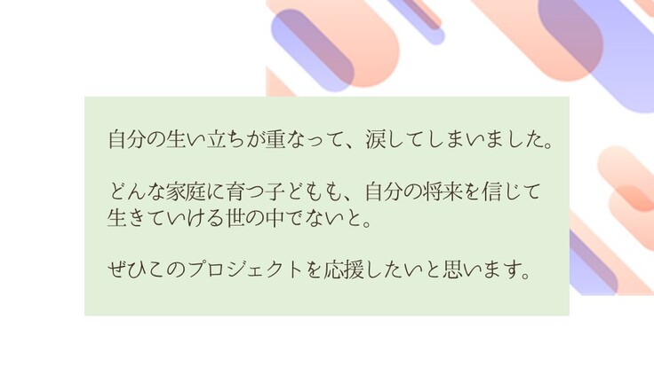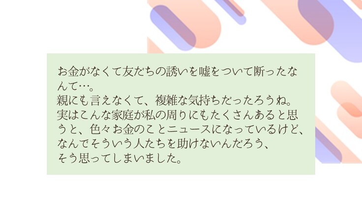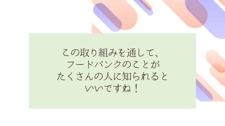 このことを全国に伝え、フードバンク活動の輪を広げるとともに、貧困と孤独に苦しむ子どもたちに知らせたい。