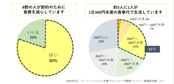 保護者向けのアンケートでは、コロナ禍の影響で「食費を削っているか?」という設問に対し、8割の保護者が「はい」と答えました。一人当たりの1日の食事代は、約3人に1人が300円未満と回答し、100円未満と回答する人も、4人いました。
