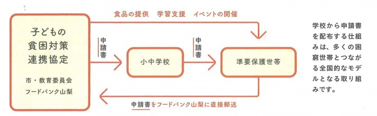 『フードバンクこども支援プロジェクト』はフードバンク山梨が日本で初めて行った、行政・学校と連携した子どもへの食料支援のシステムです。行政・学校・関係団体を通じて、対象世帯(準要保護またはそれに準ずる世帯)へ申請書をお渡しし、必要とする家庭が直接フードバンク山梨へ申し込みをします。