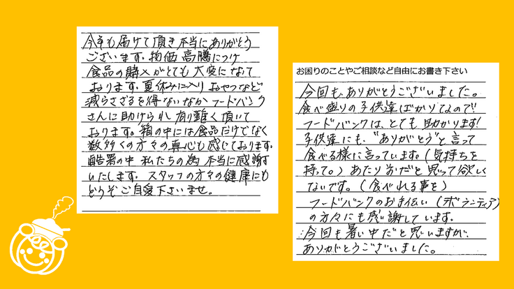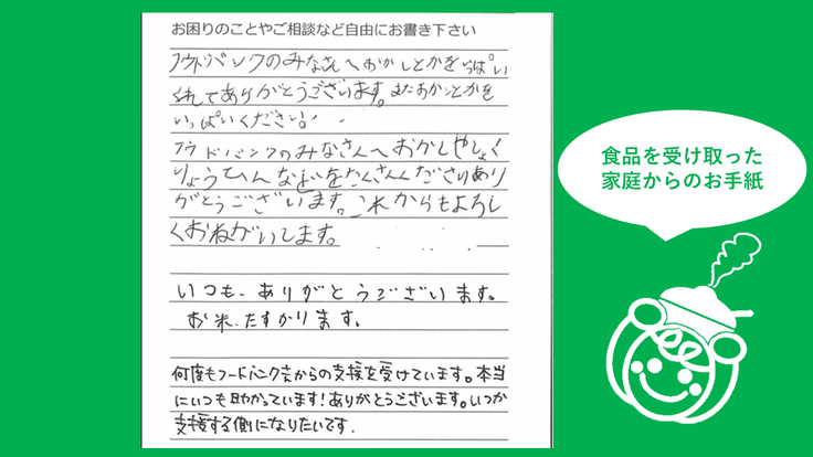 支援を受けた家庭からのお手紙の内容は、ご支援くださった皆様へもお伝えします。