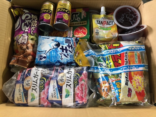 お米5kg、乾麺、パスタ、缶詰、レトルト食品、乾物、調味料、飲料、生活必需品、子どものいる家庭にはお菓子もたくさん入っています。