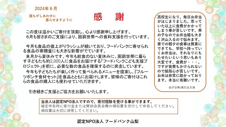 ご寄付は食品を送るための費用や一部食品の購入に使わせていただきます。