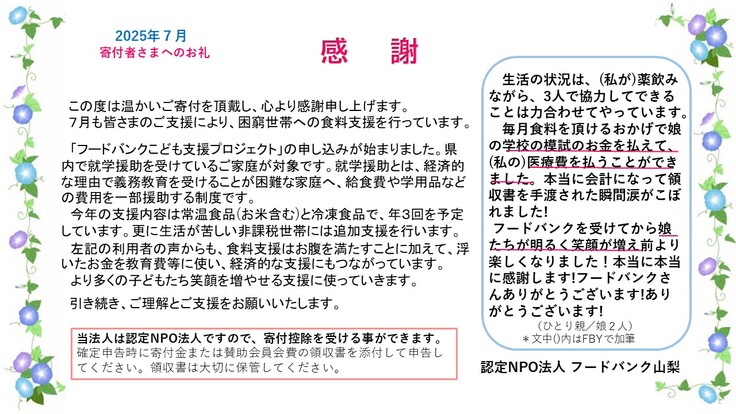 7月の寄付者さまへのお礼