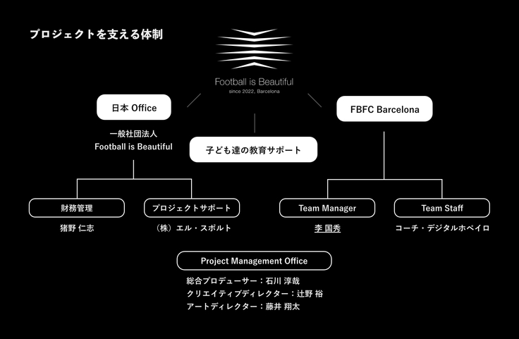 2030 年に日本が ワールドカップで優勝する。 可能だろうか? 考えてみないか? 世界のリーグで日本の選手がプレイするようになっても、私たちが感じている閉塞感。 日本のサッカーは、このままではどこにも行かないのではないか? いまここに、あなたが参加することで初めて実現する、まったく新しいプロジェクトが始まる。 15~16才の子供たちを、日本の高校ではなく3年間バルセロナを拠点としたヨーロッパで、丁寧に育てる。チャンピオンズリーグで、独特の存在感を示せる選手を、毎年このメンバーから輩出する。 母体となるのは、学校ではない。企業でもない。 サッカーを愛する一人ひとりのサポーター。 あなたもその一人。 Football is Beautiful 美しく勝とう。 日本サッカーは、まだまだやれる。ここが、その新たなスタート。