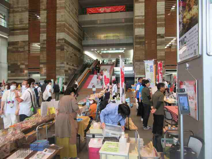 (栃木県庁内での出店の様子:たくさんの方で賑っていました。中央には「いちご」が
