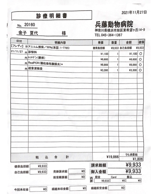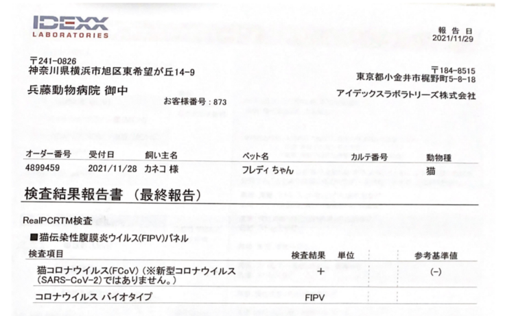 後日、獣医さんから腹水検査の結果「FIPウェットタイプだった」と告げられました。