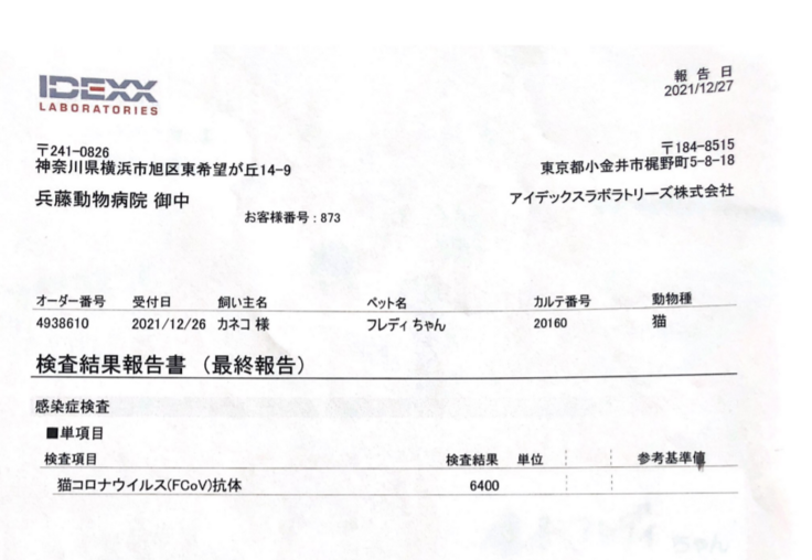 結果、猫コロナウィルス抗体の値は6400でした。(この半分が望ましいそうです)