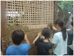去年から引き続き、建築士の講師の先生と共に小屋づくり授業が行われていますが、7月には一般参加者も募っての土壁塗りワークショップを開催しました。
