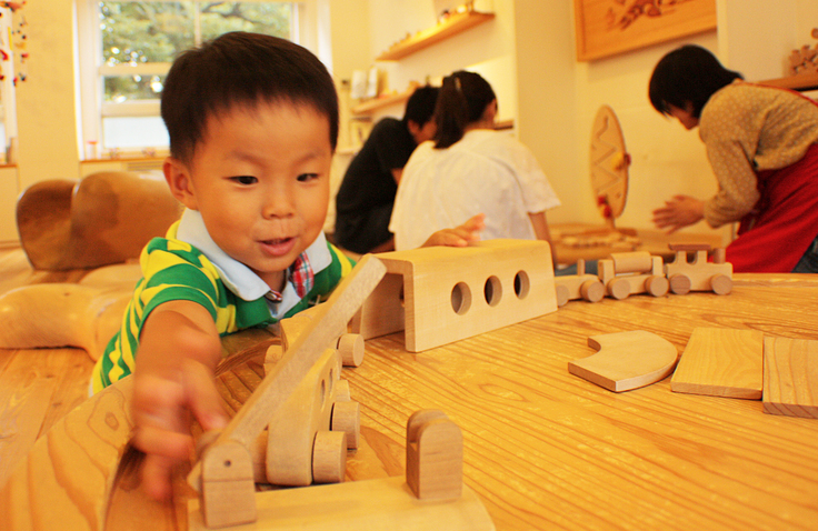森林大国・日本の豊かな森の「材」と職人の「技」。無垢材ならではの柔らかな手触りや香りは、五感を刺激し感性に響きます。館内では、赤ちゃんが木のおもちゃを気にいって離さない姿もよく見かけます。また、様々な道具や材料を活用したおもちゃづくりは大人気!創意工夫の楽しさ・自らの手を使うことへの興味をひきだします。