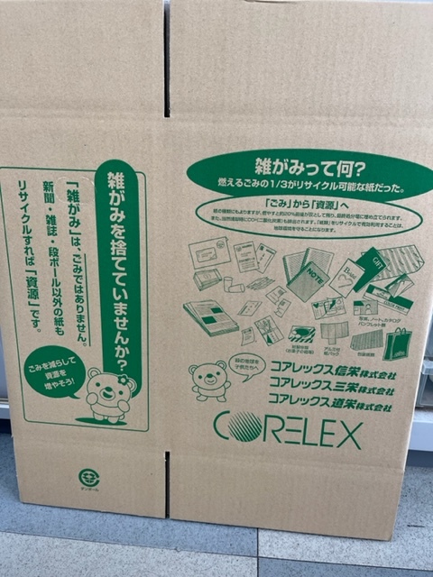 紙ごみとして焼却されている紙を、段ボール箱に入れて回収し溶解処理のあと再生紙として再資源化、再生紙の原紙からトイレットペーパーを加工、販売を行います。