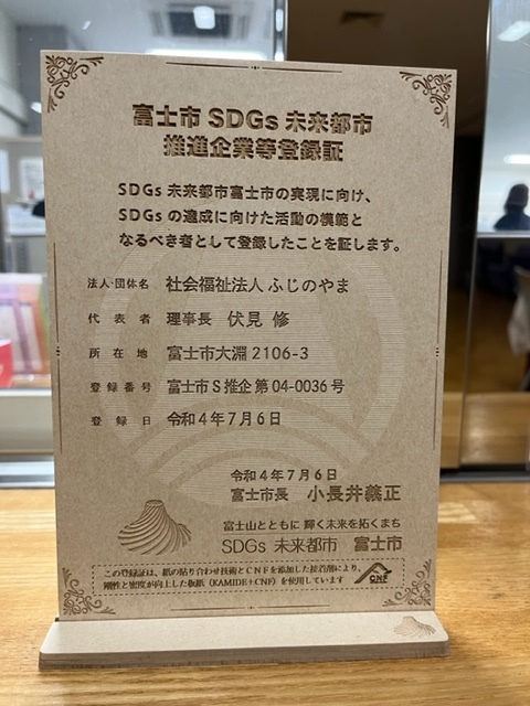 社会福祉法人ふじのやまは、富士市SDGs未来都市推進企業に登録しています。