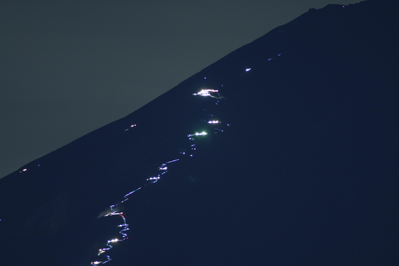 ピーク時には夜行軍の登山者の光がまるで道のようにつながります。