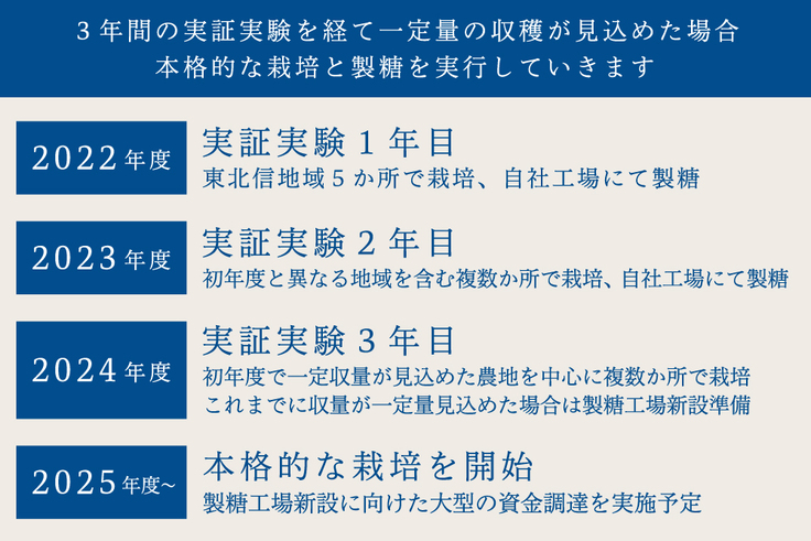 予定している実証実験の期間は3年。本年度を加え2024年度までに、3回の栽培・収穫を行います。実験を経て一定の収量が見込めた場合には、県内に製糖工場を新設のうえ、本格的な甜菜栽培とてんさい糖づくりを行い、段階的な流通拡大を目指してまいります。