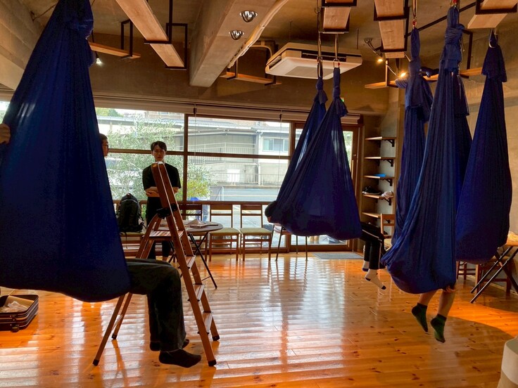 デイサービスMottoのエアリアルヨガを体験しながら、