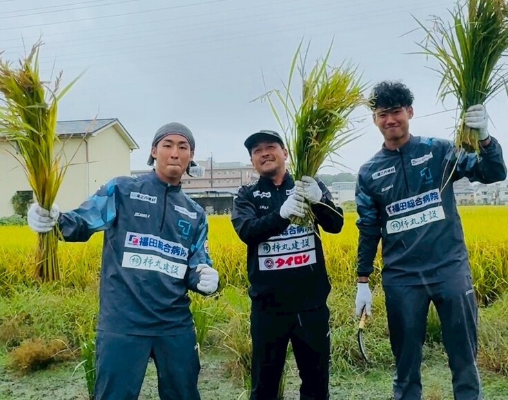 選手の皆さんが地域の方々と一緒に稲を刈る姿に、子どもたちも大喜びでした。