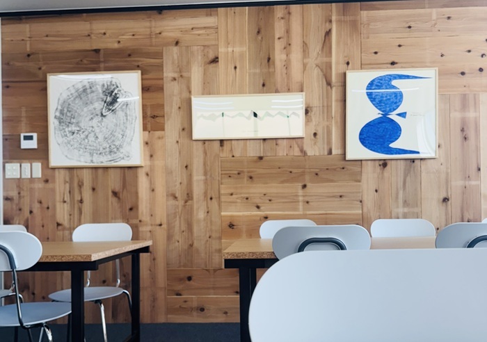 ▼お洒落なアート作品が飾られた木のぬくもりを感じるデザイン