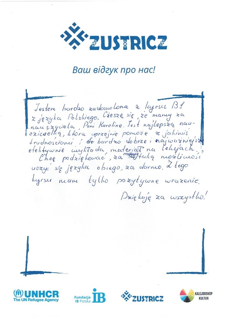 ポーランド語B1レベルのコースに非常に満足しております。カロリーナ先生が私たちの教師であることを嬉しく思います。彼女は親切に困難な点を手助けしてくださり、何よりも、授業で素材を非常に効果的に伝えてくださいます。