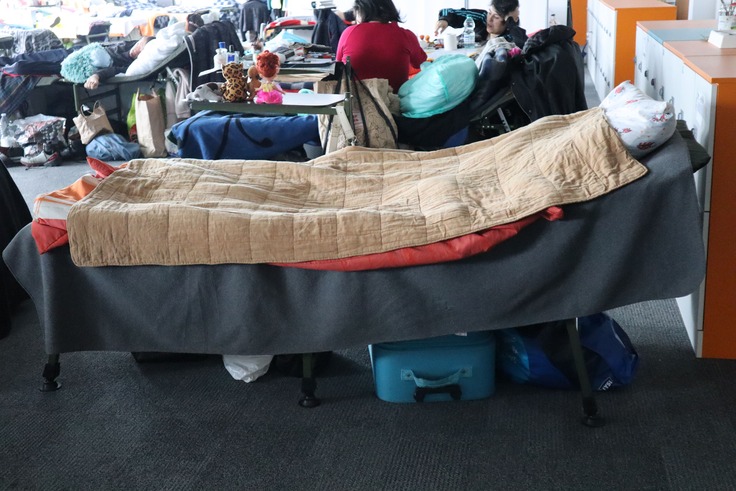 このシェルターでは、ひとり1台の簡易ベッドが提供され、たくさんのベッドが並べられた部屋が廊下の端まで続いています。