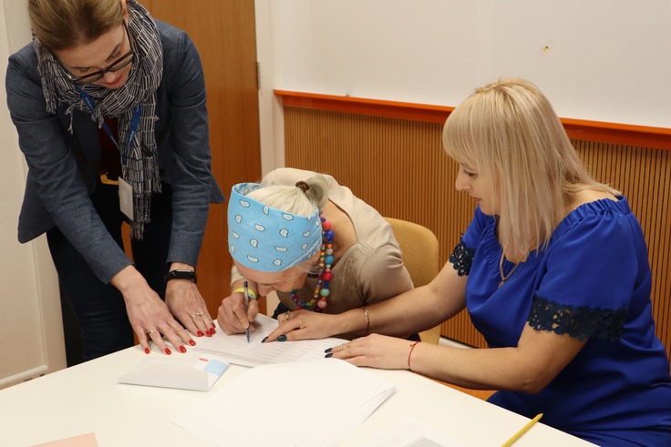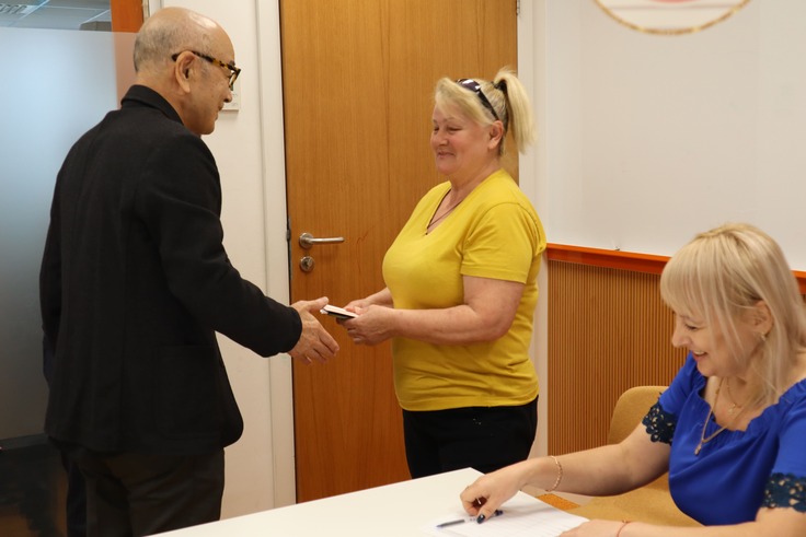 初回の商品券配布式の時と同様に、クラクフ市が作成したリストをもとに身分証明書で氏名を確認し、受領証にサインをいただきます。